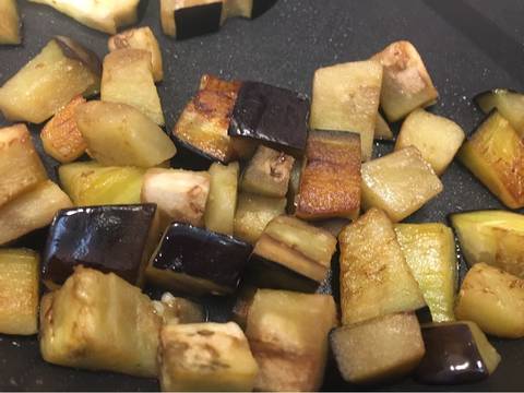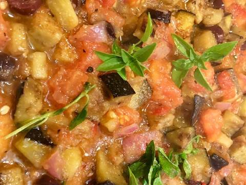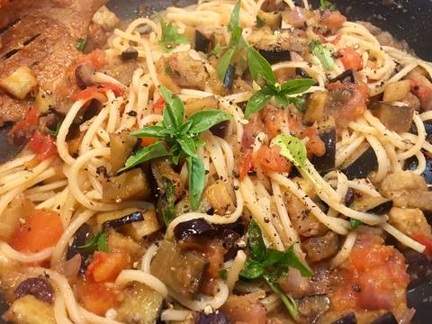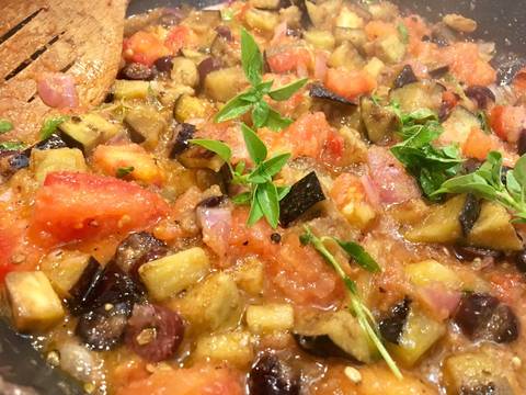 Σε ένα βαθύ τηγάνι ζεσταίνουμε το λάδι και σοτάρουμε το κρεμμυδι με το σκόρδο να μαλακώσουν.Προσθέτουμε τη ντομάτα, τις ελιές την ζάχαρη και τα αρωματικά ανακατεύουμε και τα αφήνουμε να βράσουν περίπου 10 λεπτά. Σε ένα τηγάνι ζεσταίνουμε τις 4 κουτ λάδι να κάψουν και σοτάρουμε την μελιτζάνα μέχρι να πάρει χρώμα