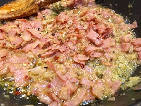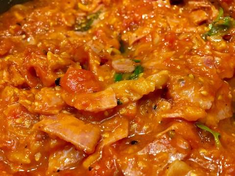 Ζεσταίνουμε το λάδι σε ένα μεγάλο τηγάνι και σοτάρουμε το κρεμμύδι προσθέτουμε το μπέικον ανακατεύοντας για 6 με 8 λεπτά ώσπου να μαλακώσουν. Προσθέτουμε το σκόρδο κομμένο, μπούκοβο, αλάτι και πιπέρι και μαγειρεύουμε για αλλά 3 λεπτά ! Στον ηλεκτρικό τρίφτη χοντρό κόβουμε τις ντομάτες, τις προσθέτουμε μέσα στο μπέικον και μαγειρεύουμε σε χαμηλή φωτιά ανακατεύοντας τακτικά για 20 με 30 λεπτά περίπου.