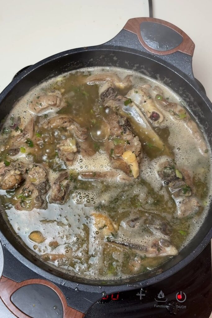Προσθέτουμε ζεστό νερό (ίσα που να σκεπάζει το κρέας), αλάτι και πιπέρι. Χαμηλώνουμε τη φωτιά και σιγοβράζουμε για περίπου 45-50 λεπτά, μέχρι το κρέας να είναι σχεδόν έτοιμο.