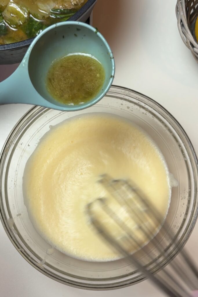 Το αυγολέμονο -διαλύουμε το κορν φλάουρ μέσα στο χυμό λεμόνι .Χτυπάμε τα αβγά σε ένα μπολ, προσθέτετε το λεμόνι και σιγά-σιγά ρίχνουμε ζωμό από το φαγητό στο μπολ (με μια κουτάλα), ανακατεύοντας συνεχώς για να μην κόψει το αυγό .