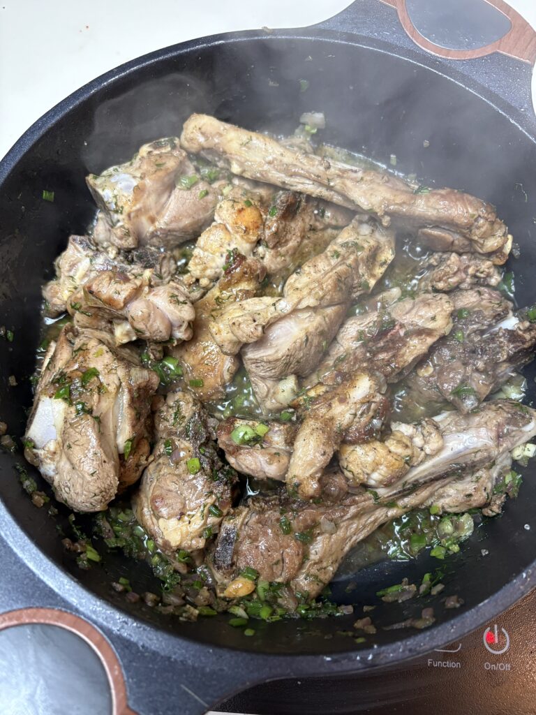 Σε μια μεγάλη κατσαρόλα, ζεσταίνουμε το ελαιόλαδο και σοτάρουμε το αρνάκι μέχρι να πάρει χρώμα από όλες τις πλευρές. Προσθέτουμε το ξερό κρεμμύδι και τα φρέσκα κρεμμυδάκια και τα φέρνουμε μερικές βόλτες μέχρι να μαλακώσουν.