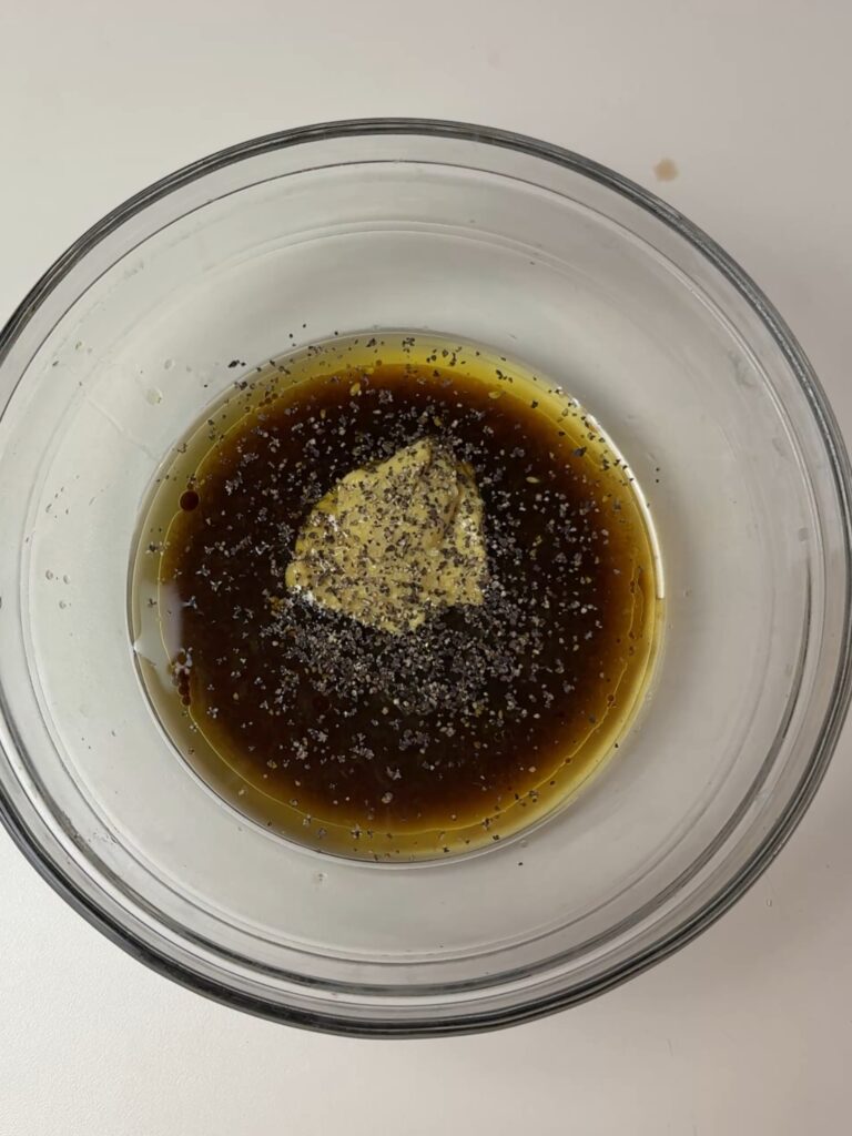 Σε ένα μικρό βαζάκι ή μπολ, ανακατεύουμε το ελαιόλαδο, το βαλσάμικο, τον χυμό λεμονιού, τη μουστάρδα, το αλάτι και το πιπέρι. Χτυπάμε καλά μέχρι να δέσει το μείγμα και να γίνει ομοιογενές.