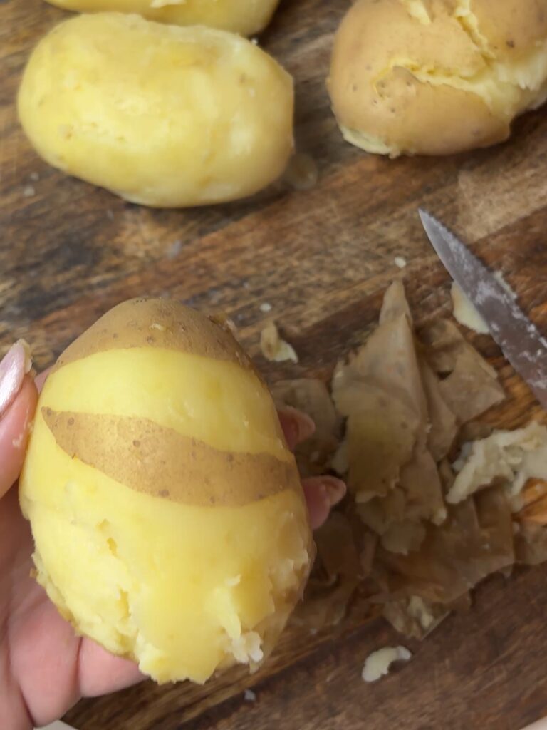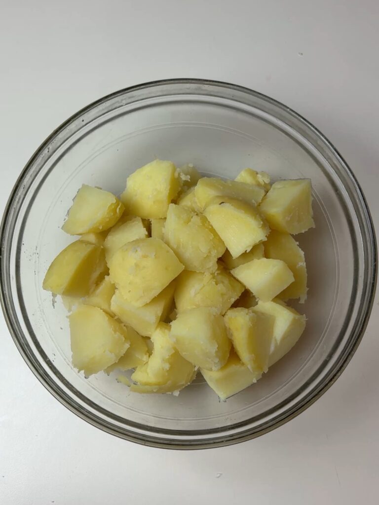 Πλένουμε καλά τις πατάτες και τις βράζουμε ολόκληρες με τη φλούδα τους σε αλατισμένο νερό μέχρι να μαλακώσουν .Τις σουρώνουμε και τις αφήνουμε να κρυώσουν ελαφρώς, ξεφλούδιζουμε και τις κόβουμε σε κύβους.