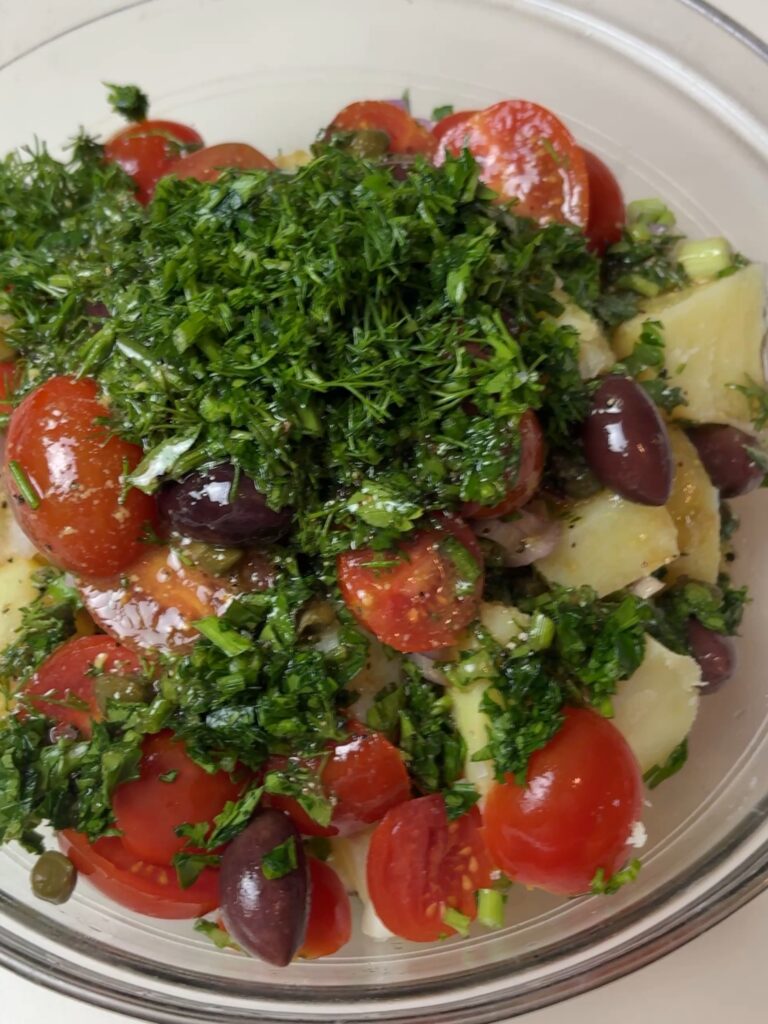 Σε ένα μεγάλο μπολ, βάζουμε τις χλιαρές πατάτες. Προσθέτουμε τα κρεμμύδια, τα ντοματίνια, την κάπαρη, τις ελιές, τον μαϊντανό και τον άνηθο. Περιχύνουμε τη σαλάτα με το dressing που ετοιμάσαμε. Ανακατεύουμε πολύ απαλά με δύο κουτάλια για να μην διαλυθούν οι πατάτες και να πάει η σάλτσα παντού. Αφήνουμε τη σαλάτα να “ξεκουραστεί” για περίπου 20-30 λεπτά πριν τη σερβίρουμε , ώστε να απορροφήσουν οι πατάτες όλα τα αρώματα του dressing.