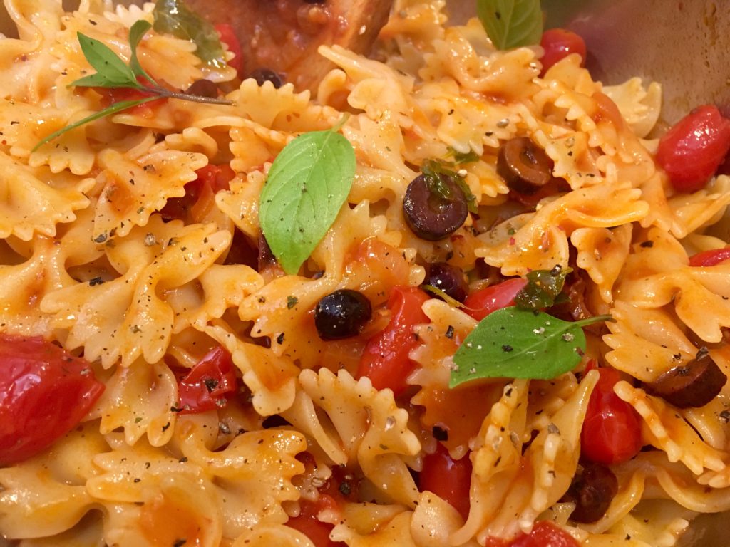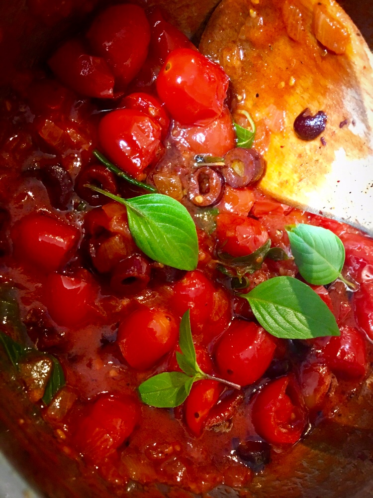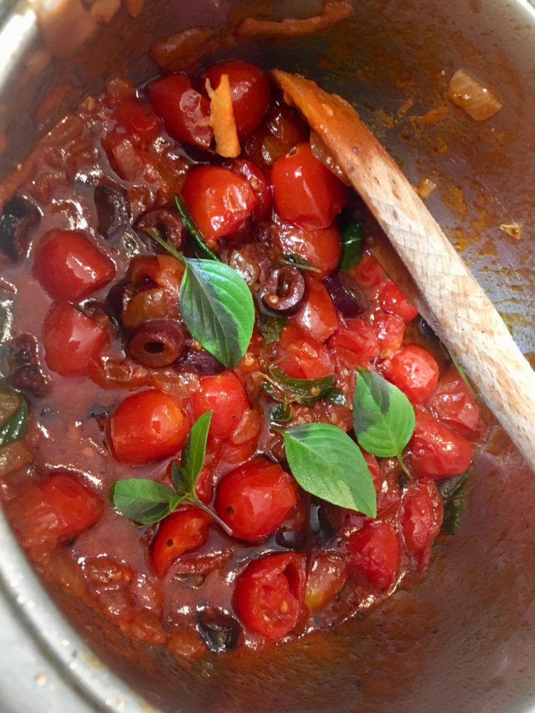 Σοτάρουμε στο ελαιόλαδο το κρεμμύδι και το σκόρδο με τα ντοματίνια τον βασιλικό, αλάτι και πιπέρι, προσθέτουμε τις ελιές και ανακατεύουμε για 2 λεπτά