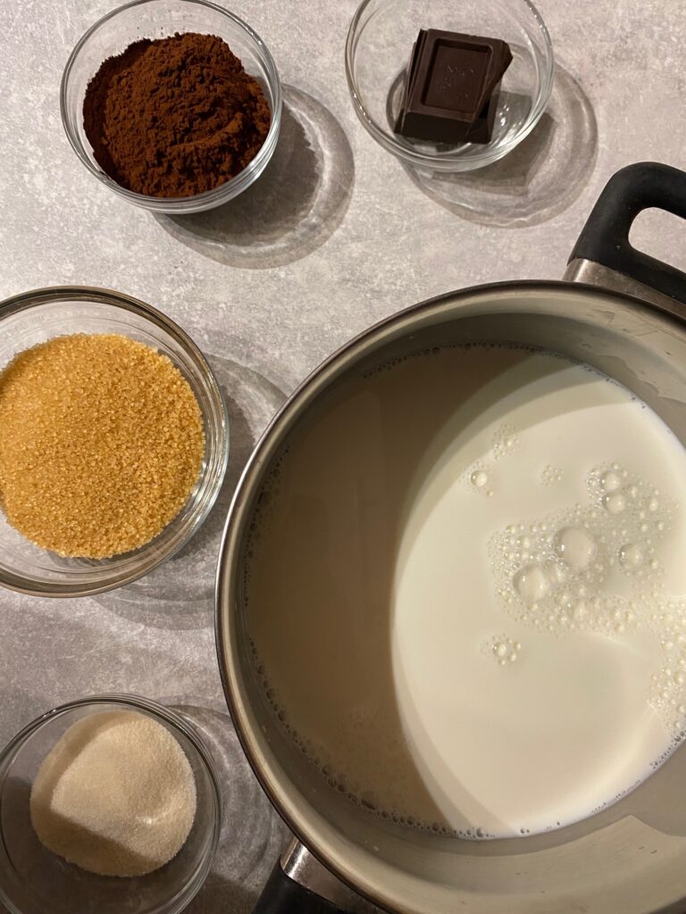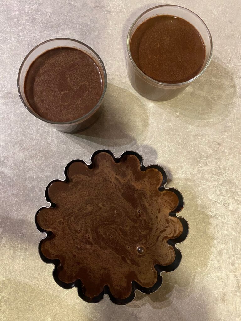 Βάζουμε όλα τα υλικά σε μια κατσαρόλα και ανακατεύουμε για 3-5 λεπτά μέχρι να λιώσουν. Κατεβάζουμε από την φωτιά τοποθετούμε σε φορμάκια ή μπολάκια και τα βάζουμε στο ψυγείο για 6 ώρες. Σερβίρουμε με φρούτα.
