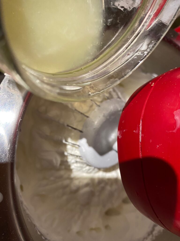Στον κάδο του μίξερ ρίχνουμε την κρέμα γάλακτος κ την χτυπάμε προσθέτοντας την άχνη ζάχαρη σταδιακά μέχρι να κάνει κορυφές. Προσθέτουμε το χυμό λεμόνι την ζαλατίνη και ανακατεύουμε.