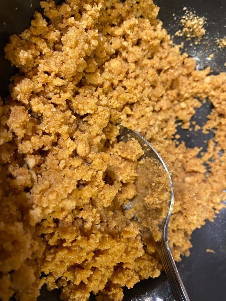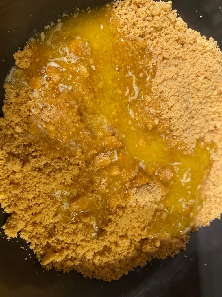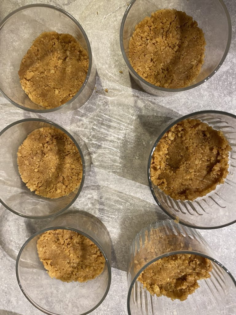 Στον ηλεκτρικό τρίφτη θρυμματίζουμε τα μπισκότα,λιώνουμε το βούτυρο σε ένα κατσαρολάκι σε σιγανή φωτιά και το ρίχνουμε μέσα στα τριμμένα μπισκότα να γίνει σαν βρεγμένη άμμος, το στρώνουμε σε μπολάκια, δυο κουταλιές στο καθένα.