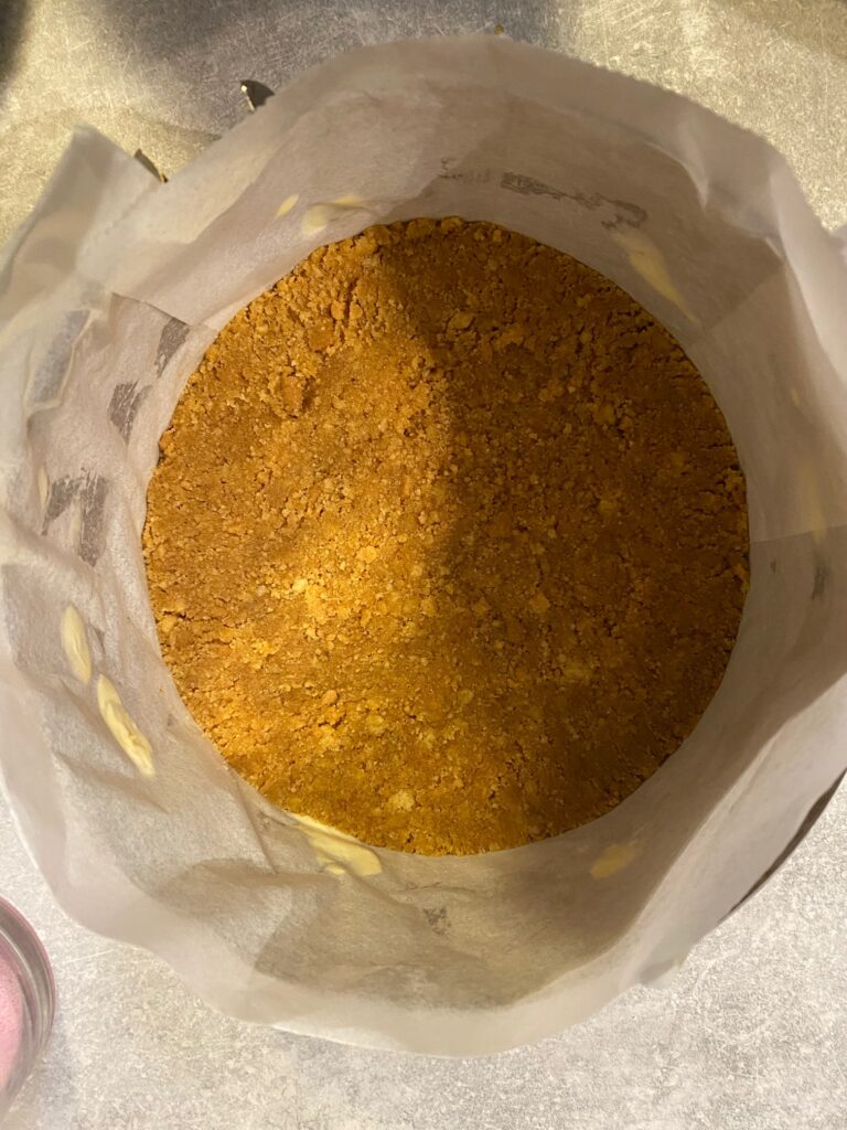θρυμματίζουμε τα μπισκότα στον ηλεκτρικό τρίφτη , λιώνουμε το βούτυρο σε ένα κατσαρολάκι και τα ανακατεύουμε όλα μαζί μέχρι να γίνει σαν βρεγμένη άμμος. Τοποθετούμε μια λαδόκολλα γύρω απο ένα τσέρκι 20 εκατ και πατάμε με ένα κουτάλι τα μπισκότα. Στρώνουμε καλά το μείγμα ώστε να έχουμε μια βάση πάχους περίπου 2 εκ.