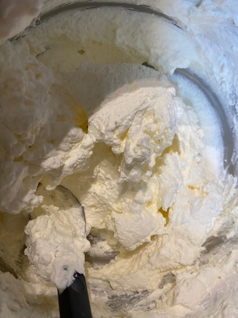 Στον κάδο του μίξερ ρίχνουμε την κρέμα γάλακτος και την χτυπάμε προσθέτοντας την άχνη ζάχαρη σταδιακά μέχρι να γίνει μια σφικτή σαντιγί. Στη συνέχεια ρίχνουμε το τυρί κρέμα και ανακατεύουμε μέχρι να ενσωματωθεί.