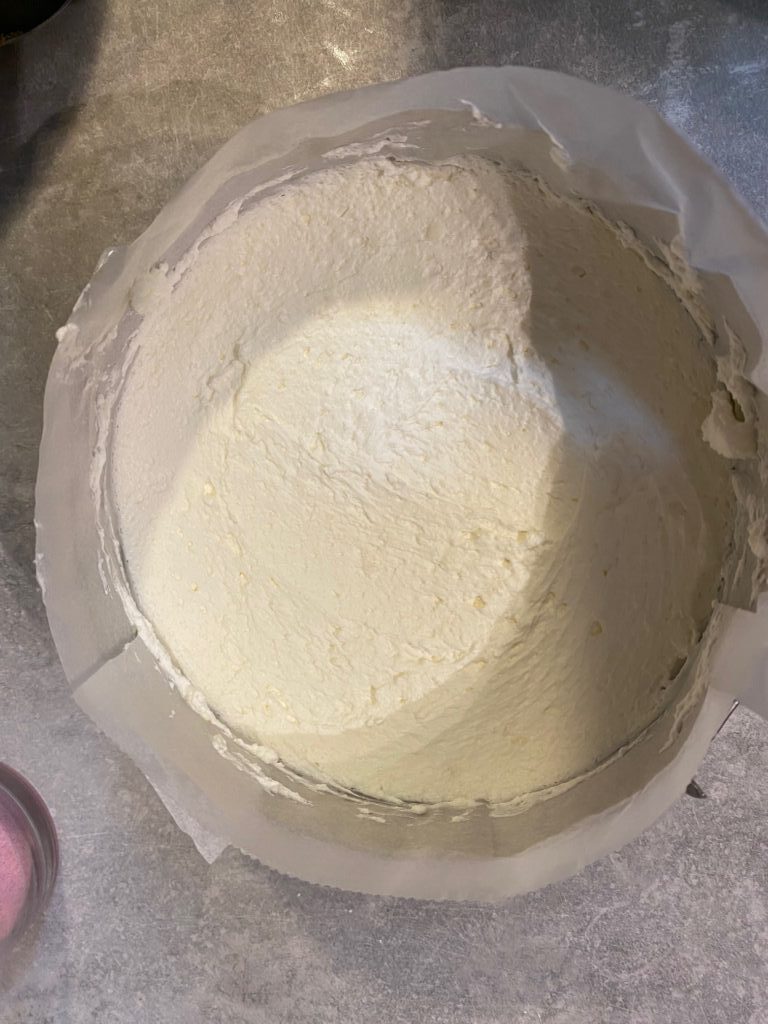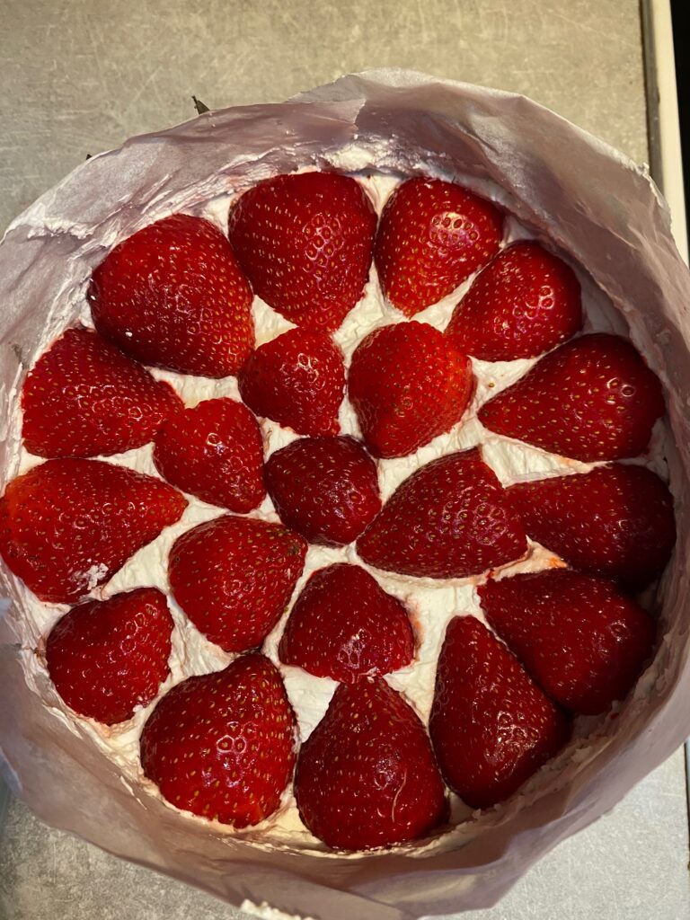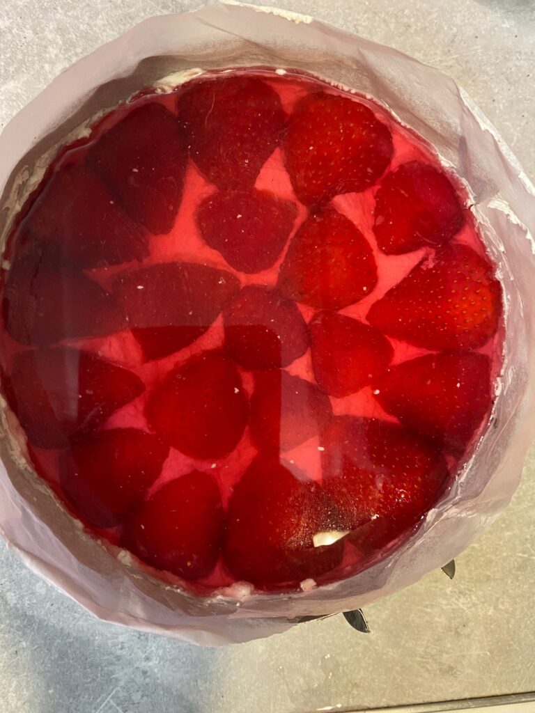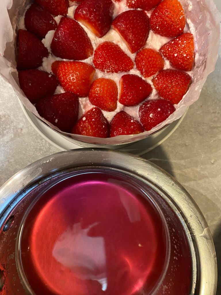 Αφού έχει παγώσει το γλυκό ρίχνουμε πάνω από τις φράουλες το παγωμένο ζελέ με ένα κουτάλι σιγά σιγά. Βάζουμε ψυγείο για άλλες 5 ώρες . Αφού έχει δέσει το γλυκό βγάζουμε το τσέρκι και αφαιρούμε προσεχτικά την λαδόκολλα. Κόβουμε και απολαμβάνουμε!