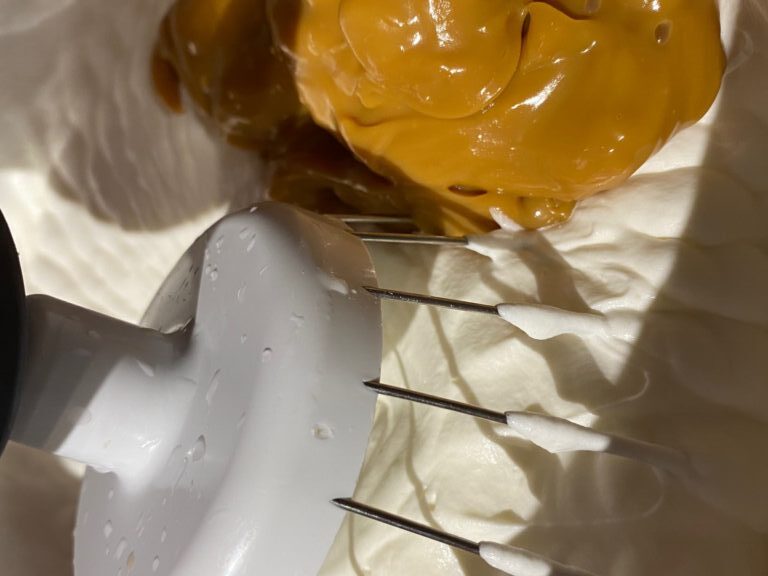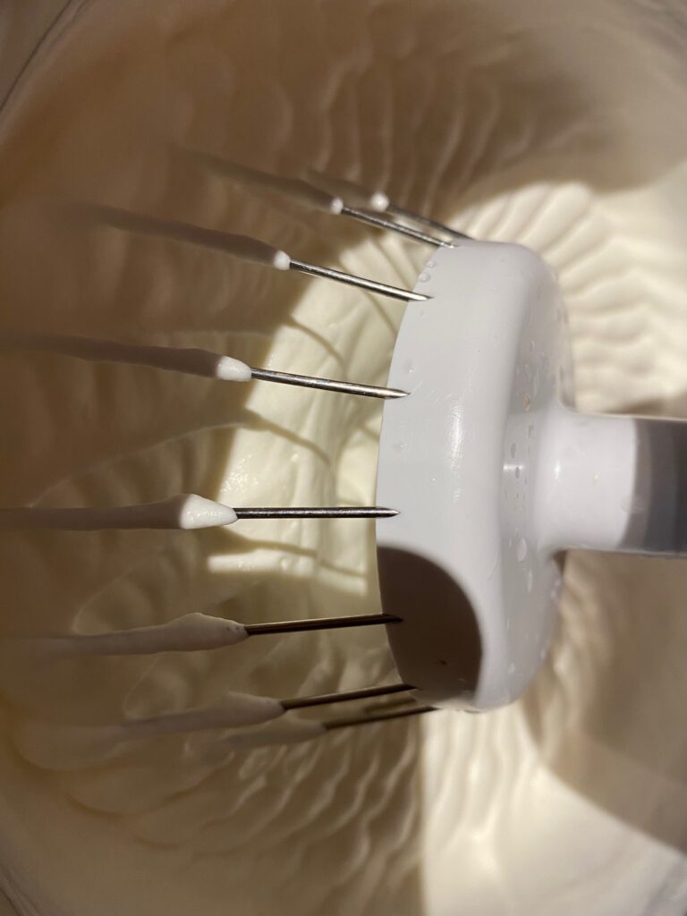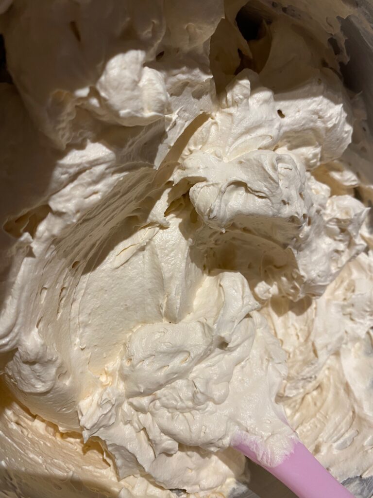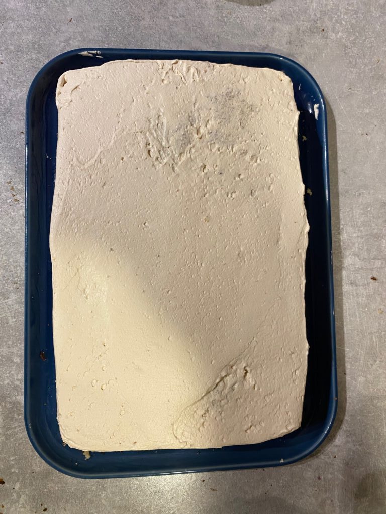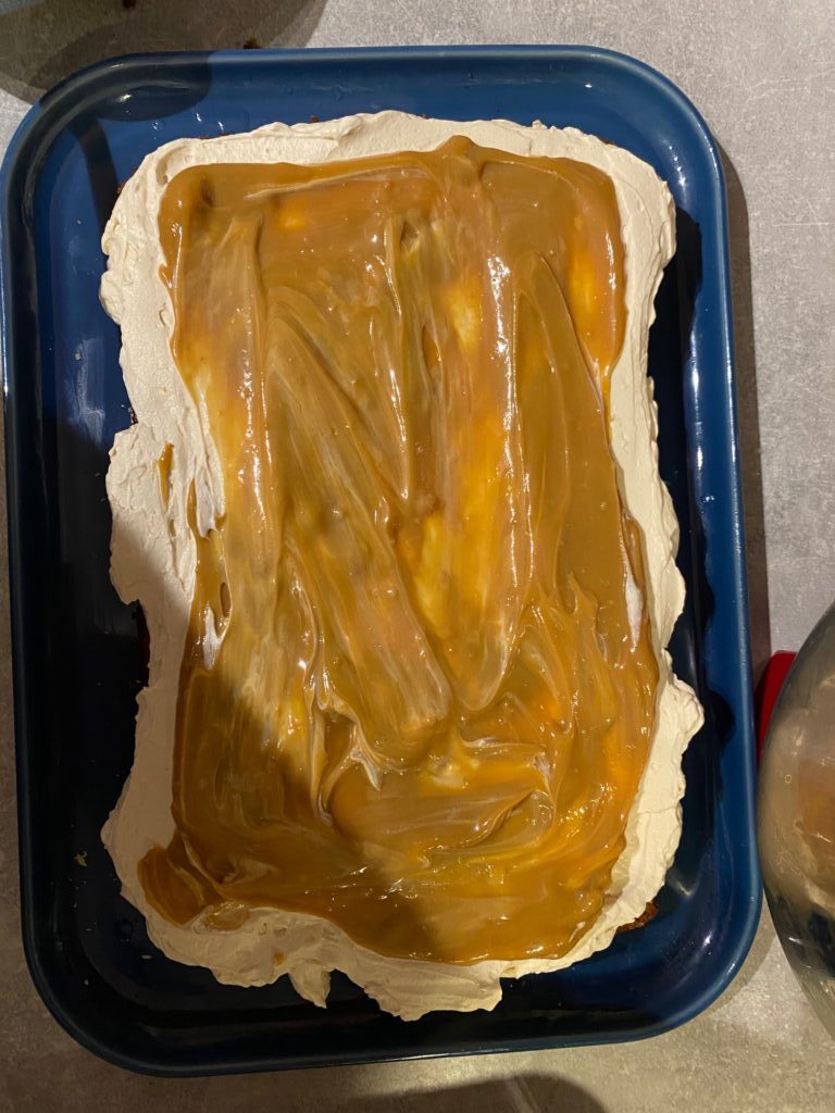 Χτυπάμε την κρέμα γάλακτος μέχρι να κάνει κορυφές και προσθέτουμε μέσα το 1 κουτί καραμελωμένο ζαχαρούχο γάλα, ανακατεύουμε μέχρι να γίνει μια ομοιόμορφη κρέμα