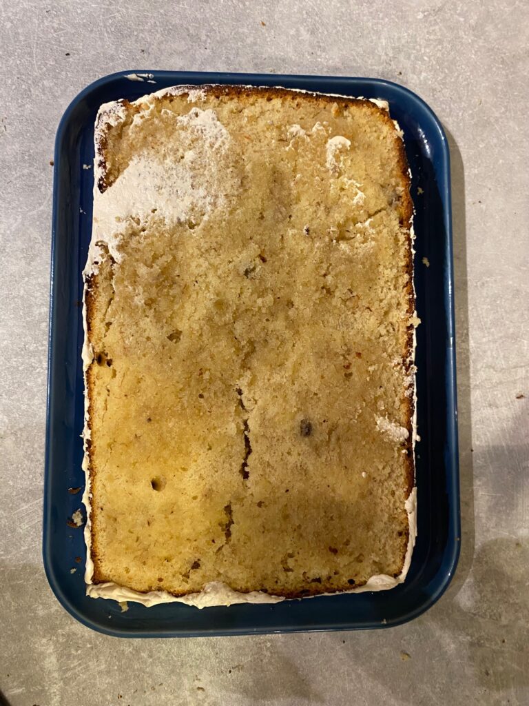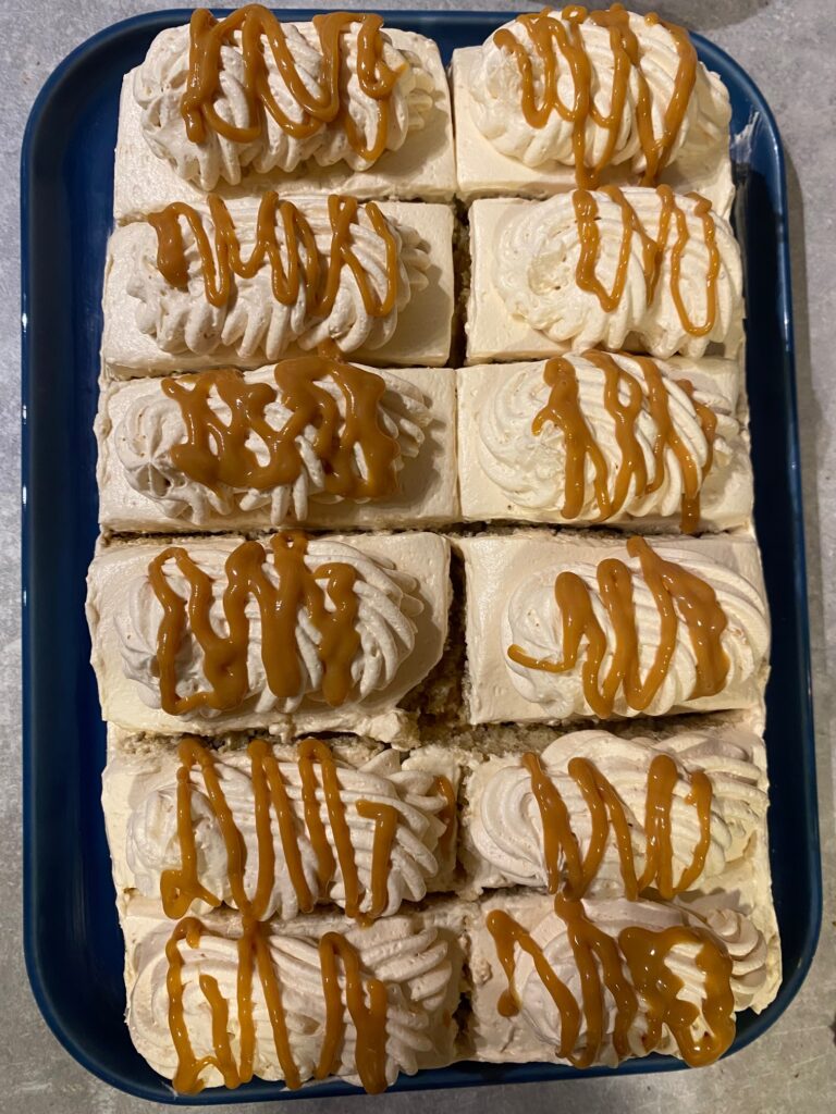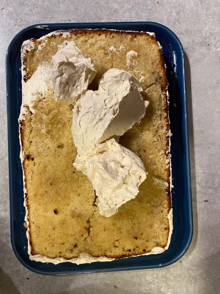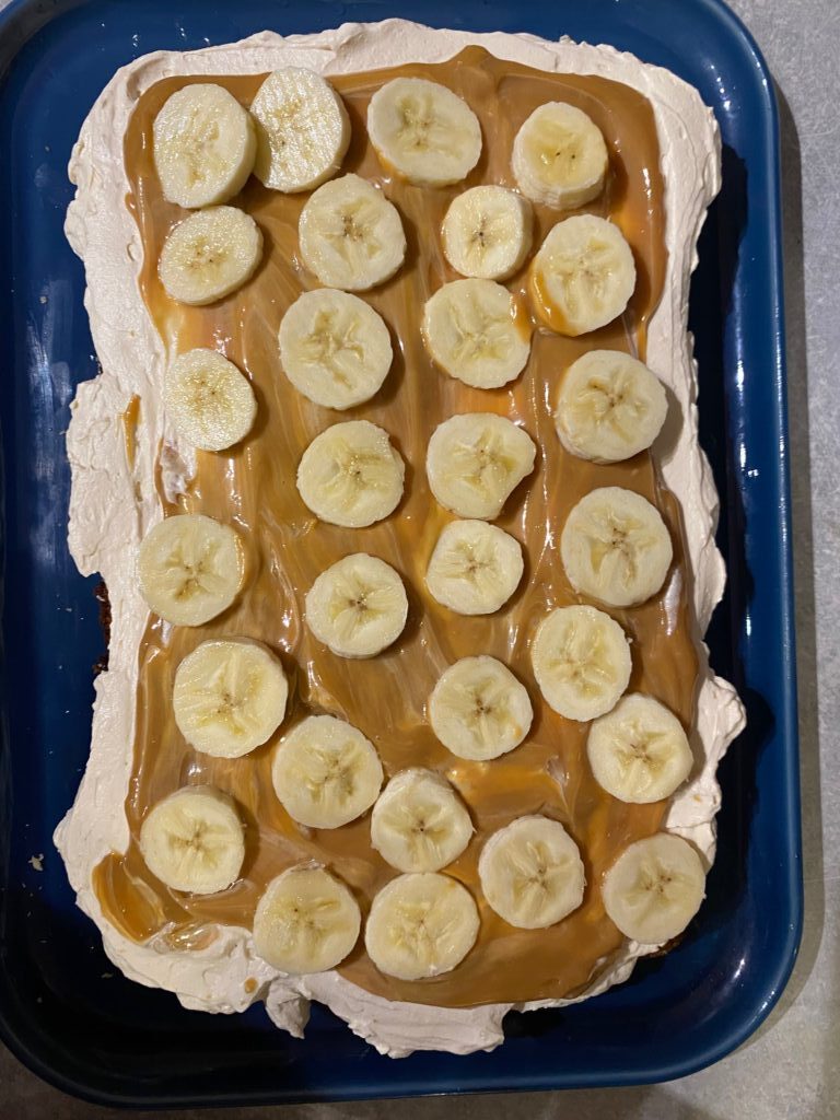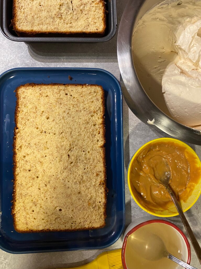 Στη συνέχεια εφτιαξα ένα σιρόπι και μια καραμελένια κρέμα ! Έκοψα φέτες το παντεσπάνι που είναι γεμάτο από γεύση μπανάνα, το σιρόπιασα ελαφρα και του φόρεσα την κρέμα απο πάνω, πρόσθεσα πάνω στην κρέμα καραμέλα και φέτες μπανάνα. Έκλεισα με άλλη μια φέτα παντεσπάνι πασπάλισα με σιρόπι και έντυσα απ’έξω ξανά με κρέμα. Το έκοψα κομμάτια και το γαρνίρισα με κρέμα. Πάσπάλισα και λίγη καραμέλα από πάνω έτσι για την τσαχπινιά!!!